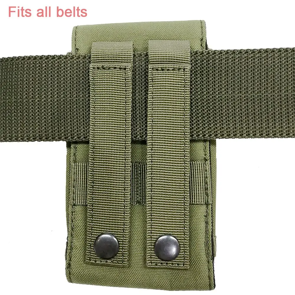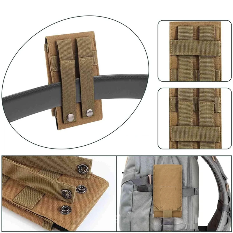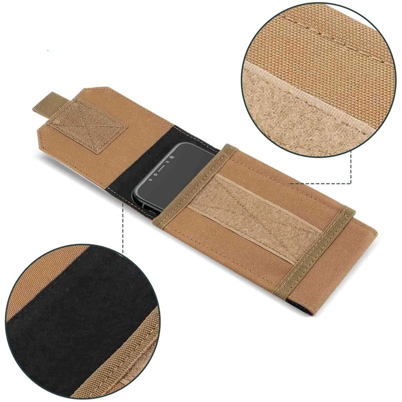 Design to hold bigger than 5.5 inch cell phones, can wear on the belt and be attached to MOLLE webbing vest, backpack, platform...etc.